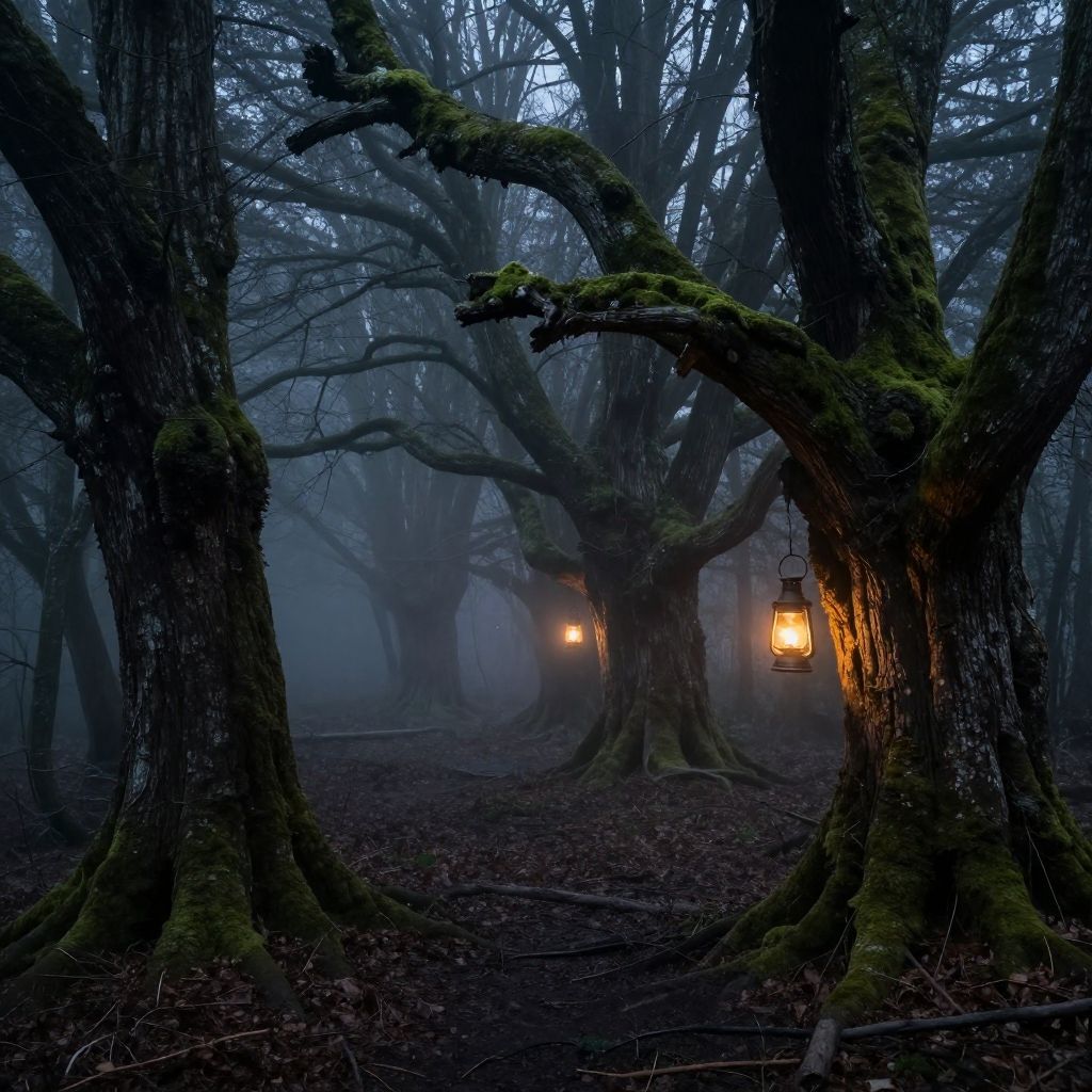 Dark creepy forest with ancient dead trees covered in moss, fog rolling along the ground, dimly lit by flickering lanterns, sinister whispers in the silence, unsettling mood
