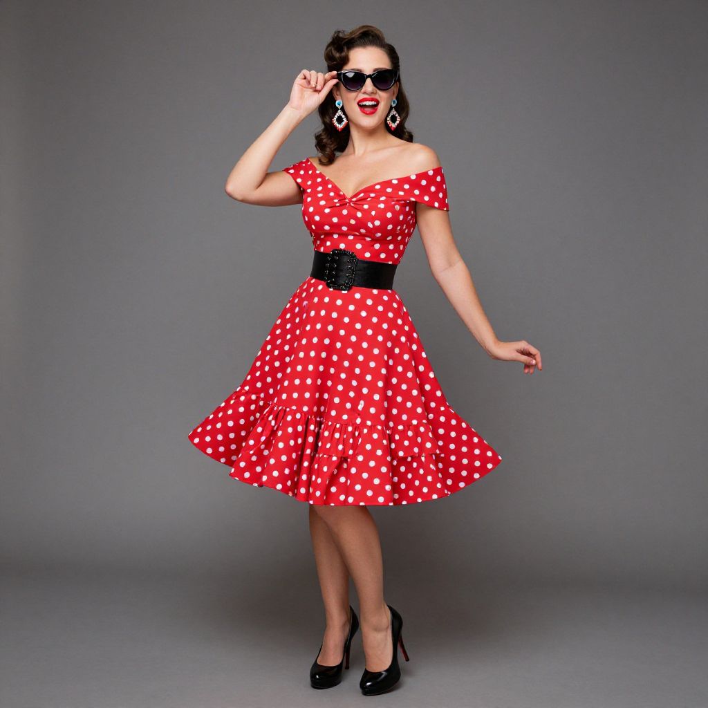 Full body shot, woman, rockabilly off-shoulder dress, vibrant cherry red, white polka dots, fitted bodice, flared skirt, layered ruffles, soft cotton fabric, vintage-inspired, wide black belt, cinched waist, retro cat-eye sunglasses, red lipstick, classic pin-up hairstyle, playful and flirty, high-heeled black pumps, bold statement earrings, playful accessories, lively and fun atmosphere Sexy. Pretty face and beаutiful eyes. Big breasts