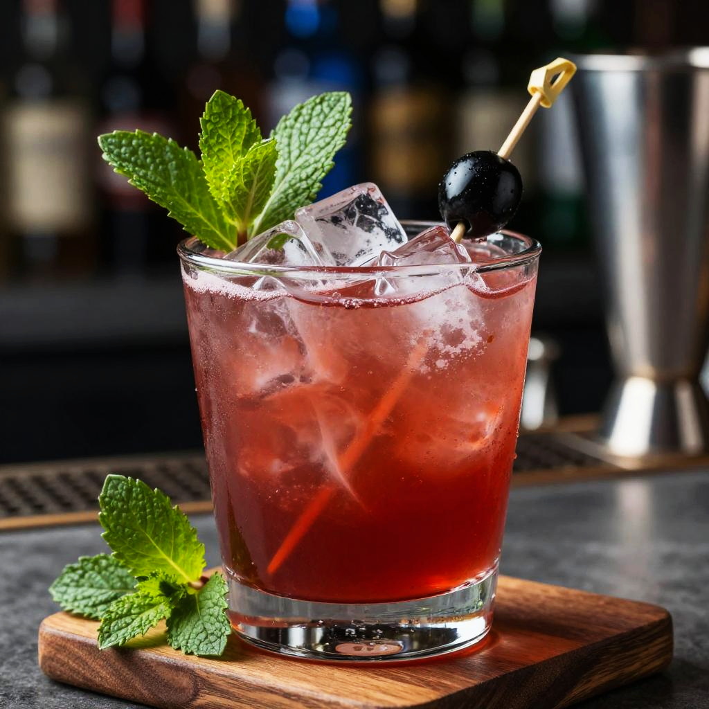 Photograph of a vibrant red cocktail in a clear glass, filled with ice cubes and garnished with a fresh mint leaf and a black olive on a toothpick. The background is blurred with blue and green lights, giving a bar or club atmosphere. A lime and another mint leaf rest on the wooden coaster underneath the glass. The drink is illuminated, highlighting the ice and liquid.