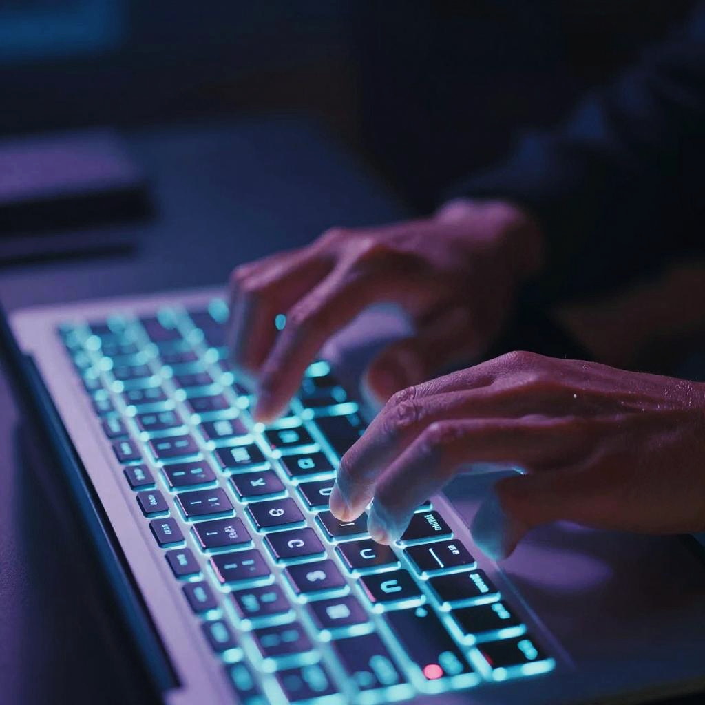 Photograph of hands typing on a glowing blue backlit keyboard in a dimly lit environment, highlighting the illuminated keys.
