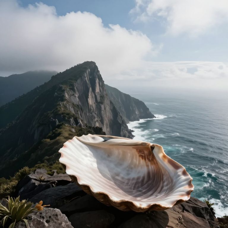 A mountain peak bends over the horizon like a sea shell, the ocean pouring into its hollow and flowing upward into the clouds.