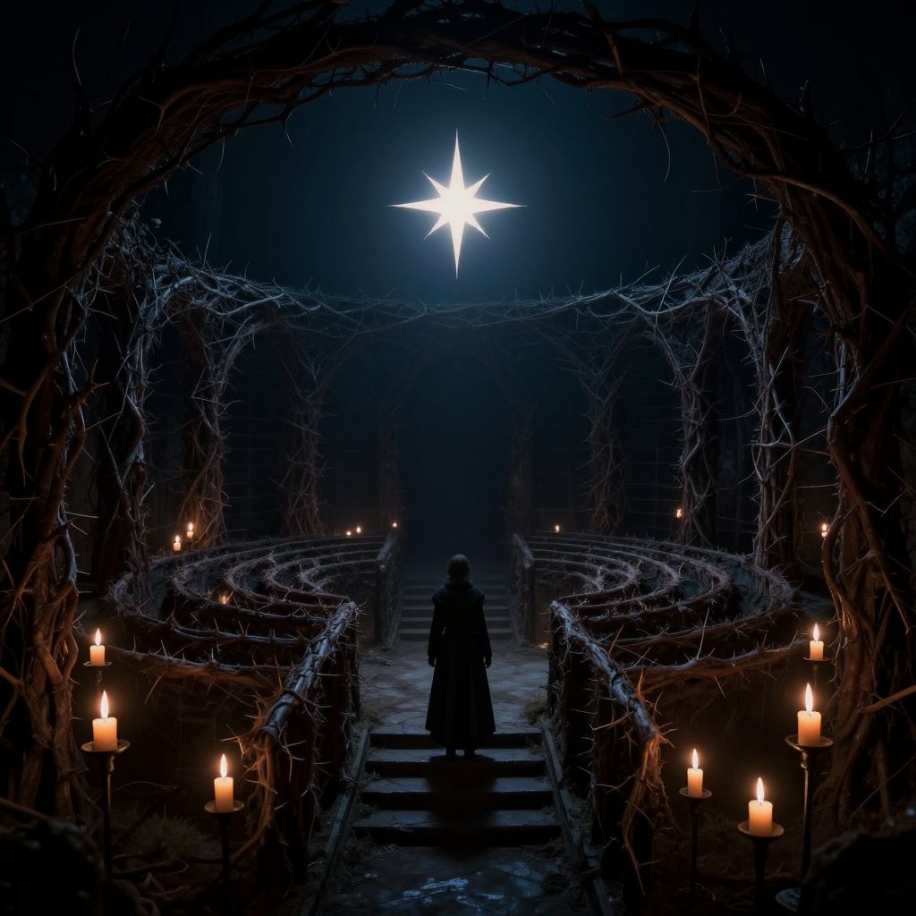 A visually striking dark fantasy scene depicting a labyrinth made of twisted thorn branches forming circular arches. At the center, a bright, flickering star shines in the night sky, illuminating a lone figure in fantasy attire standing on stairs leading into the labyrinth. The figure is dressed in dark, medieval-style clothing, suggested to be a bard, surrounded by numerous lit candles on metal stands, creating a mystical and atmospheric setting.