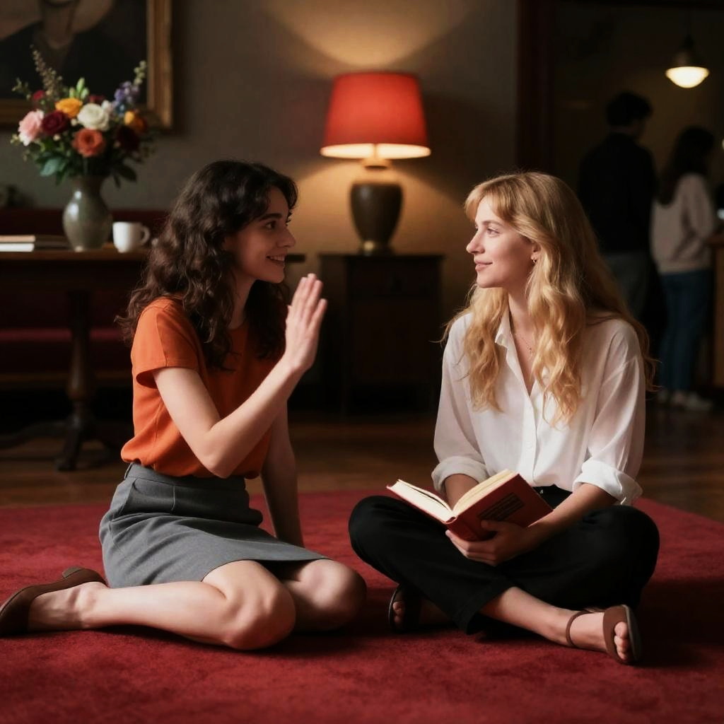 Warm, dimly lit indoor birthday party featuring three women smiling and interacting around a table with lit candles. The woman on the left has blonde hair and wears a patterned blouse with jeans, the woman in the middle has dark hair and wears a white blouse, and the woman on the right has brown hair and wears a red sleeveless dress. A plate with baked goods and several candles are on the table, with a child with curly hair looking at the candles. Background shows other guests, framed windows, and curtains.
