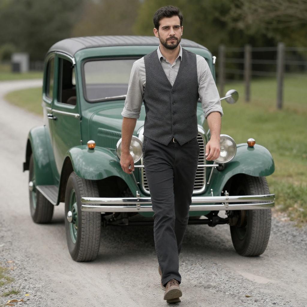 Photograph of a man with dark hair and beard, wearing a beige coat and black suit, running towards a gray vintage car with open driver's side door. Background has modern buildings and construction cranes. Overcast sky, rocky ground.