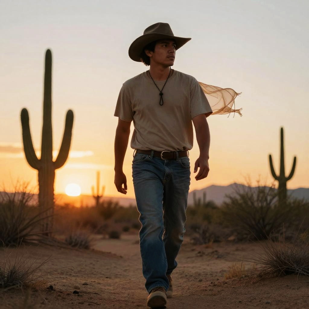 Young Mexican man walking through a desert landscape at sunset, wearing a wide-brimmed hat and casual jeans, warm hues in the sky with cacti silhouettes, wind gently blowing his shirt, calm yet strong expression, highly detailed natural environment evoking freedom and connection to land.