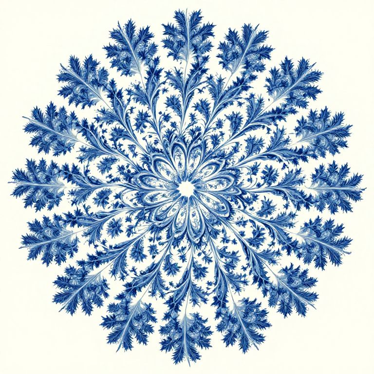 Fractal-like patterns radiate outward in symmetrical branches, resembling intricate, dark blue leaves against a pale background, creating a mesmerizing, organic mandala effect.
