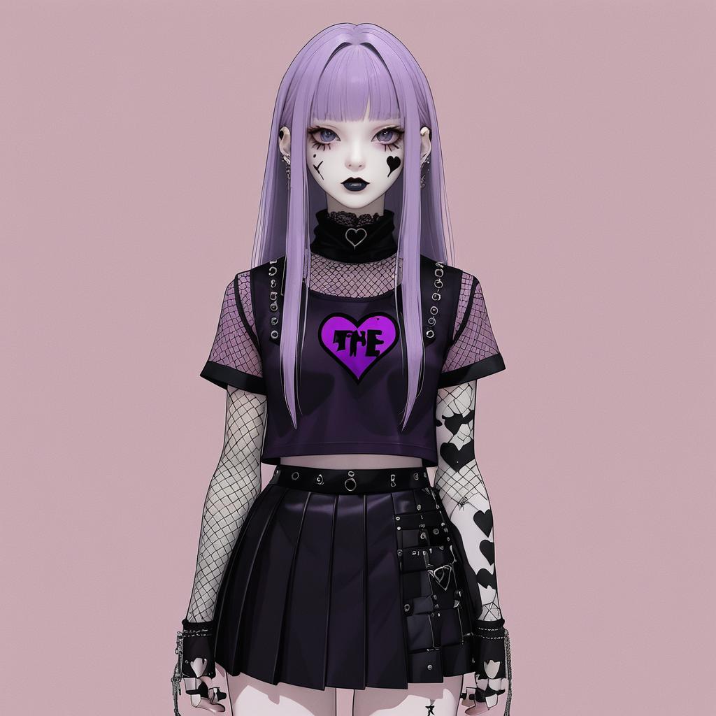 A young woman with a gothic punk style, illustrated in clean anime style with flat shading. She is wearing a high-neck fishnet shirt with a stitched heart emblem, paired with pleated mini skirt with netting and patches. Her hair is styled in long straight lavender hair with black tips, with deep violet eyes, soft makeup, and a pale skin tone. Set against a simple muted dusty pink background, the aesthetic is modern, edgy, and slightly rebellious, with high detail on clothing textures and accessories.