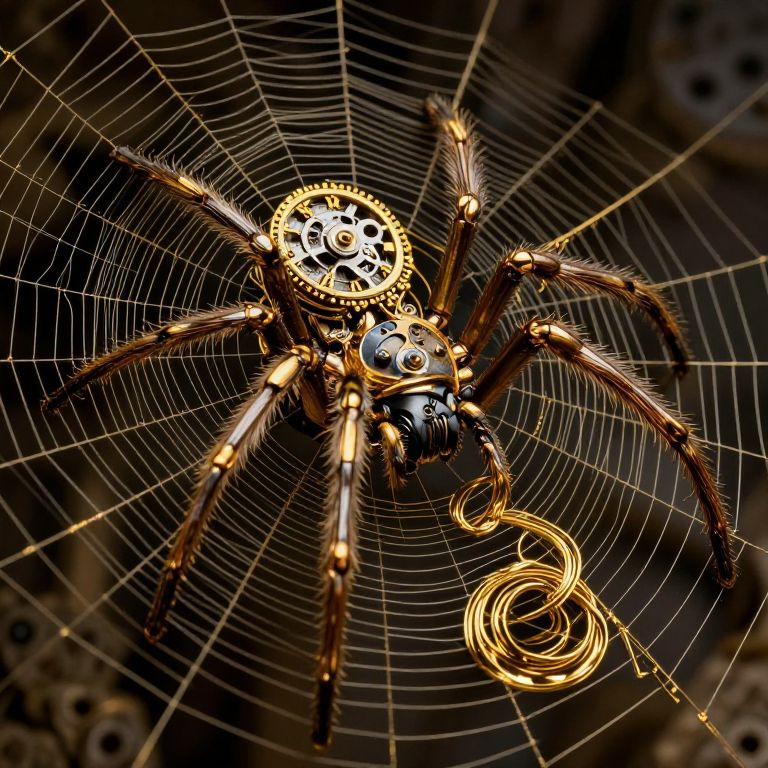 A colossal clockwork spider weaves a tapestry of time from strands of molten gold, its every twitch rewriting history in shimmering loops.