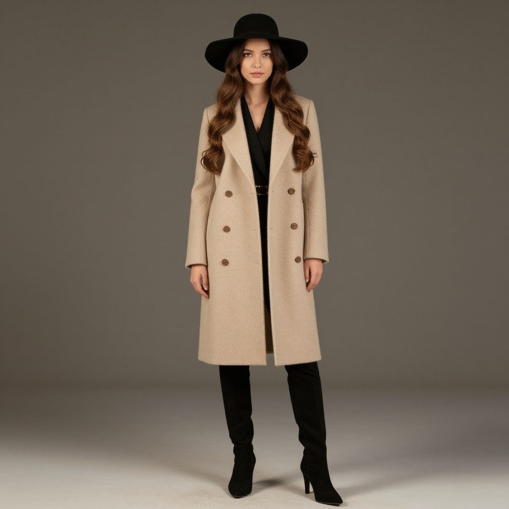 Girl with blonde hair and blue eyes is wearing a brown outfit with a brown hat and a brown scarf.