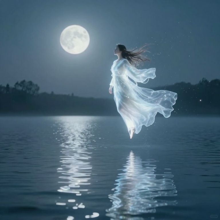 Photograph-like digital art of a woman with flowing, translucent white dress, illuminated from within, leaping into a dark, moonlit lake. The full moon, positioned upper left, casts a bright, silver reflection on the water's surface. Her long, dark hair fans out as she leaps, with droplets of water visible around her. The background features a silhouetted treeline against the night sky, creating a serene, mystical atmosphere. The image emphasizes ethereal beauty and movement, with a cool blue and white color palette.