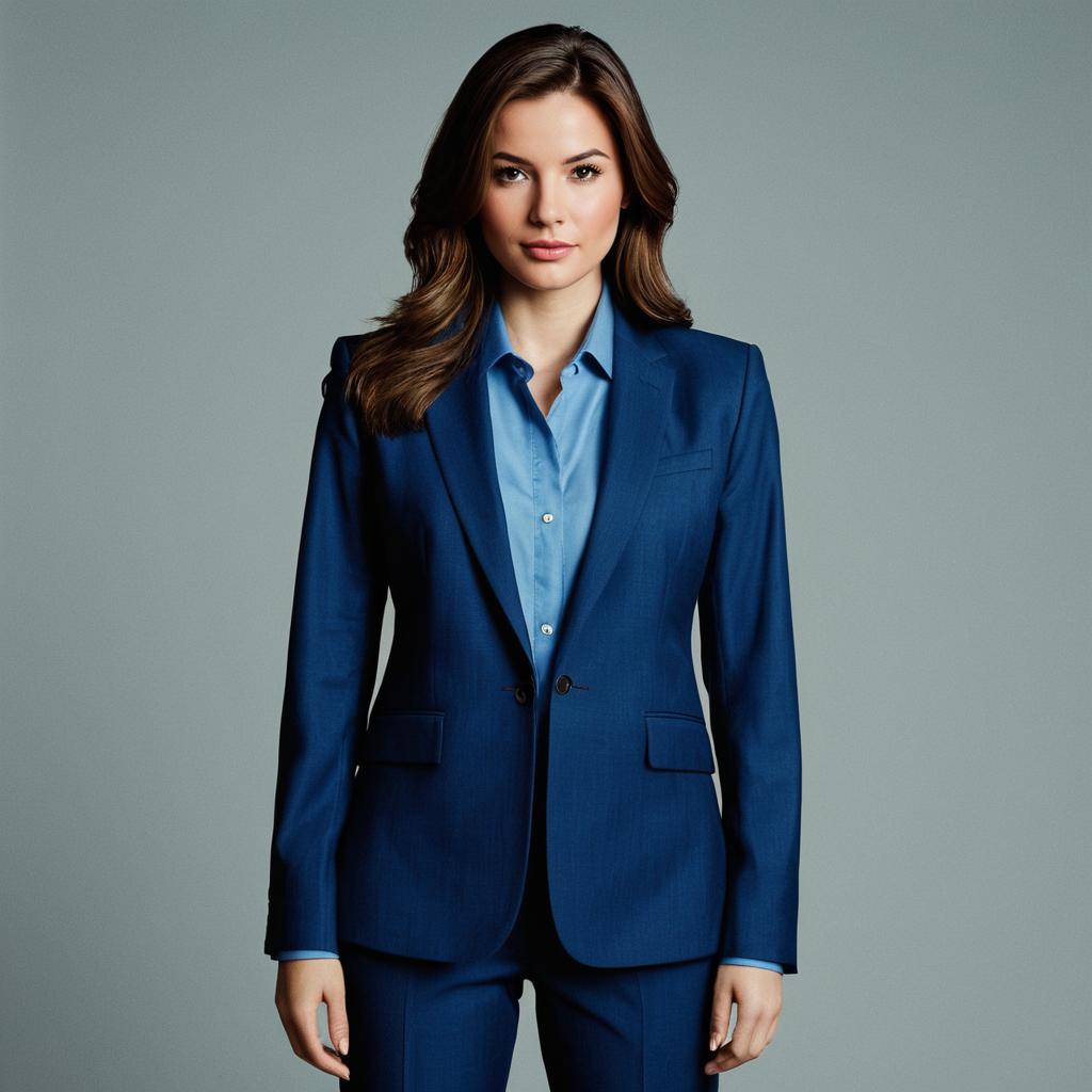 Portrait of a slender young blonde woman with long hair and brown eyes, wearing a navy petite trouser suit with a tailored jacket and matching pants. She has on a white shirt under the jacket, posing confidently against a plain brown background.