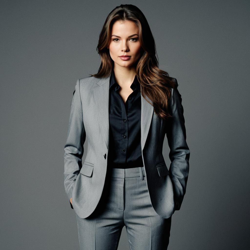 Ladies petite trouser suits,solo, realistic, 1girl, suit, formal, blonde hair, pants, long hair, jacket, brown hair, brown eyes, brown background, shirt, simple background