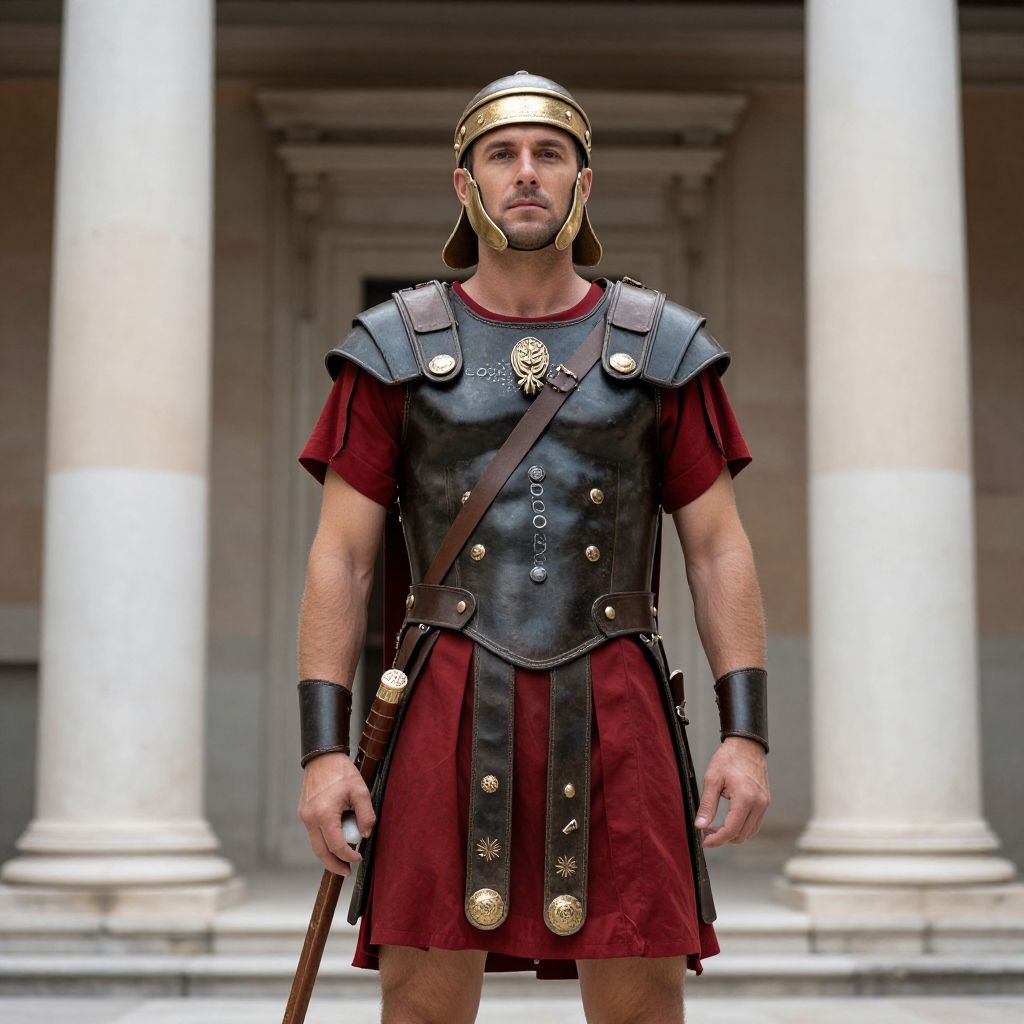Roman Soldier Costume, man in roman costume standing in front of a building