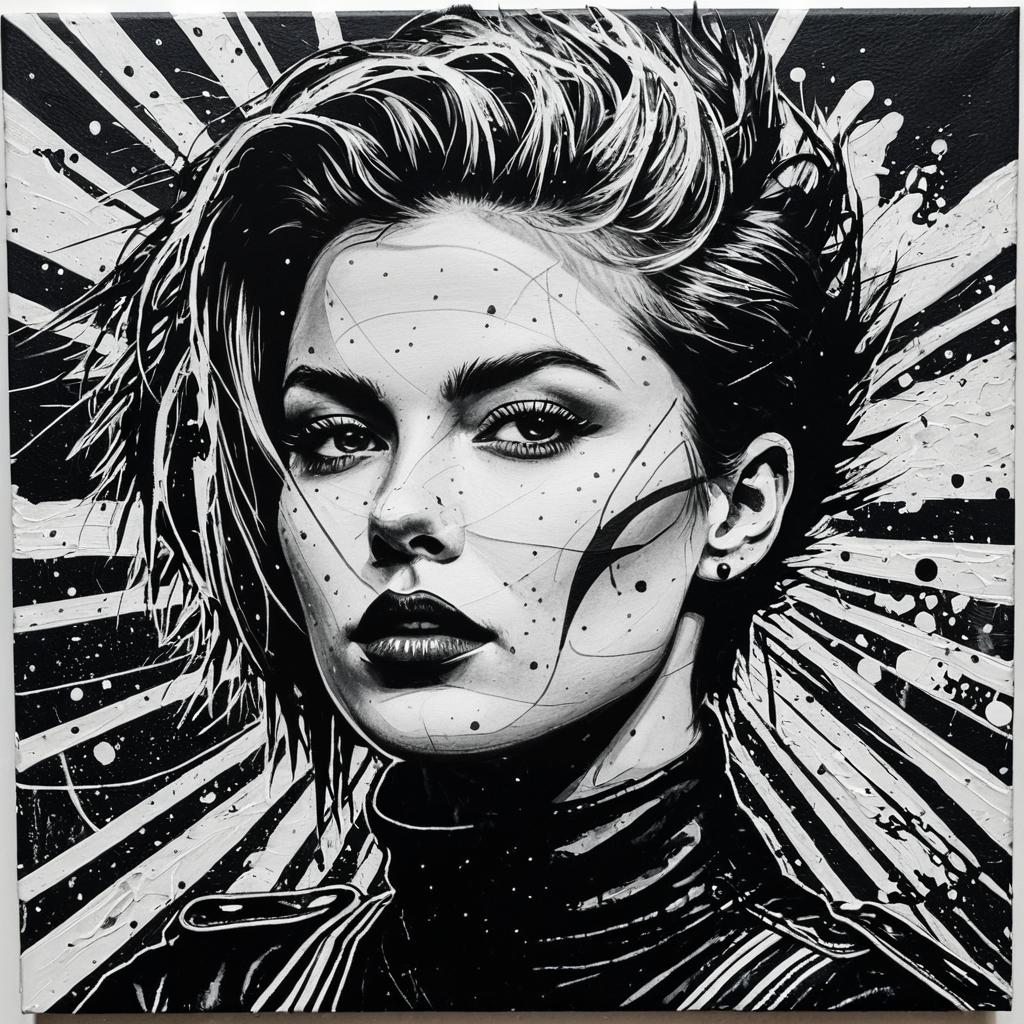 A vibrant and expressive abstract painting of a woman's face featuring bold splashes of blue, pink, yellow, and black colors. The artwork highlights the woman's striking eyes, short hair with colorful streaks, and detailed facial features, framed by dripping paint textures and artistic background.