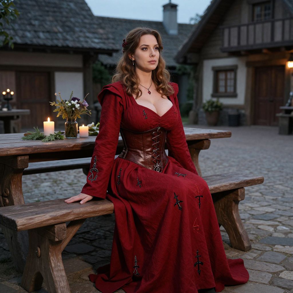 A realistic lifestyle-style photo of a woman in a full medieval witch costume, sitting on a creaky wooden bench in a rustic village square at twilight, wearing a long-sleeved crimson robe with embroidered black symbols, a leather corset with visible curves, big breasts accentuated by the fabric and cleavage, eyes thoughtful and calm, surrounded by glowing candles and herbs on a wooden table.