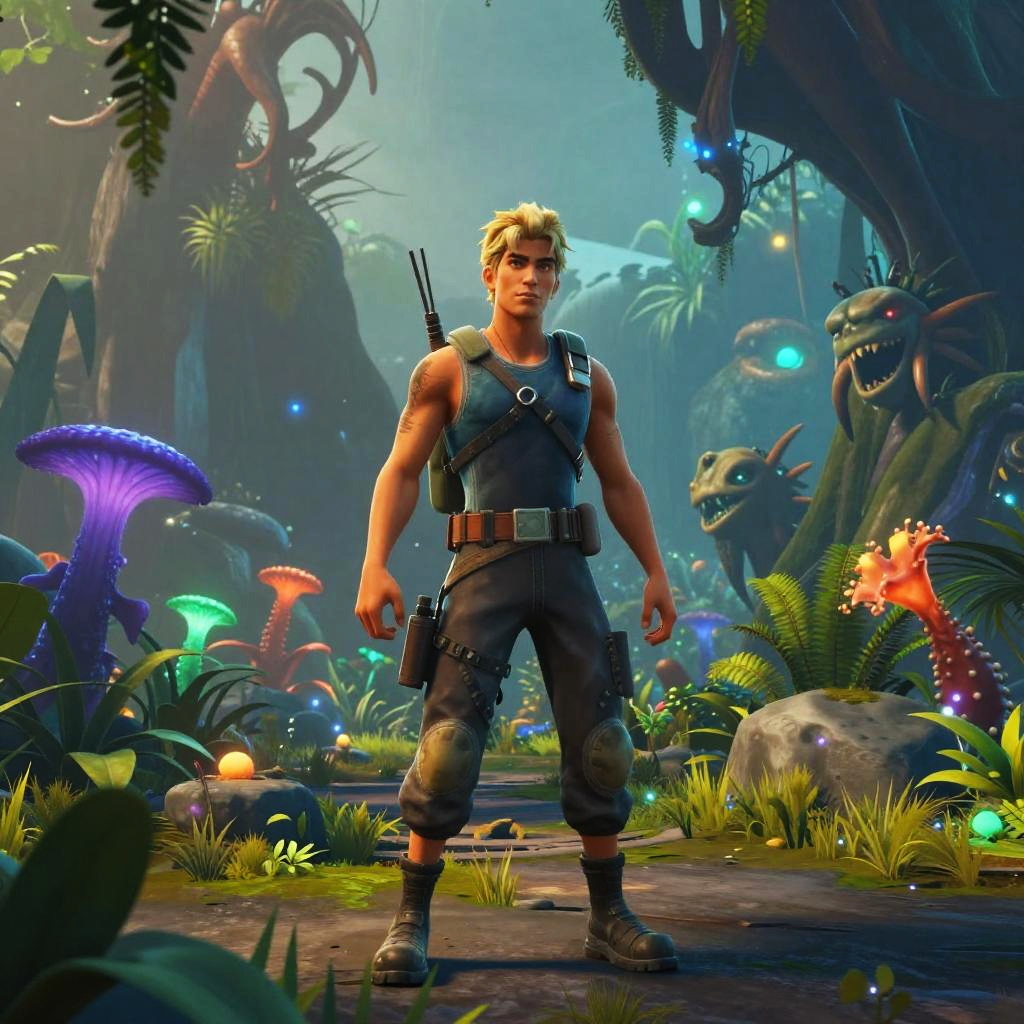 Fortnite Floyd exploring an alien jungle environment with bioluminescent plants and mysterious creatures, atmospheric foggy lighting, combining realism and fantasy elements, immersive and detailed digital art