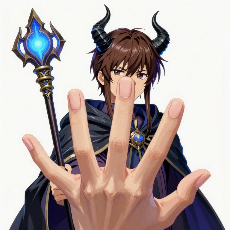 Rangefinder Thick paint style, shōnen, brunette hair, black horns, magician, staff, blue light effect, robe, anime style,five fingers,Delicate finger detailing.,