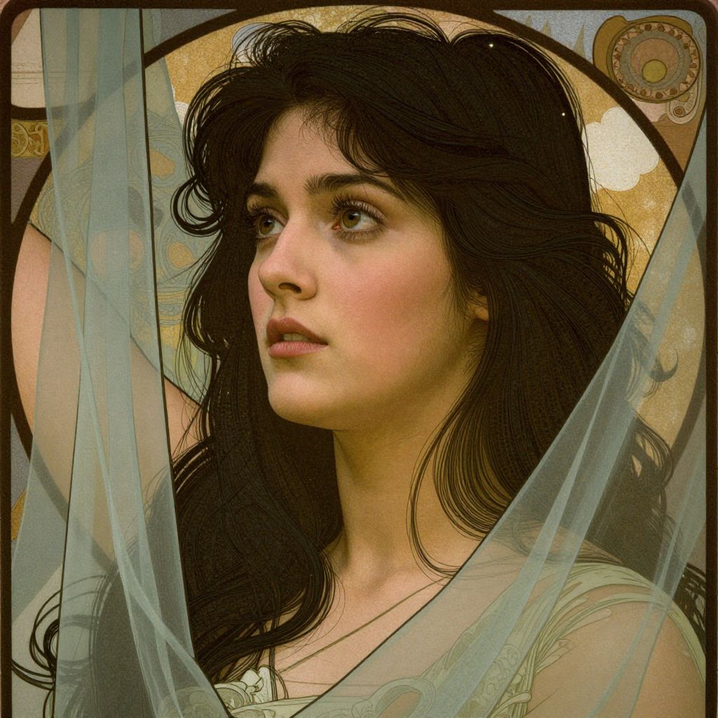 Digital painting of a fair-skinned woman with dark, wavy hair, gazing thoughtfully. She's framed by translucent, patterned curtains against