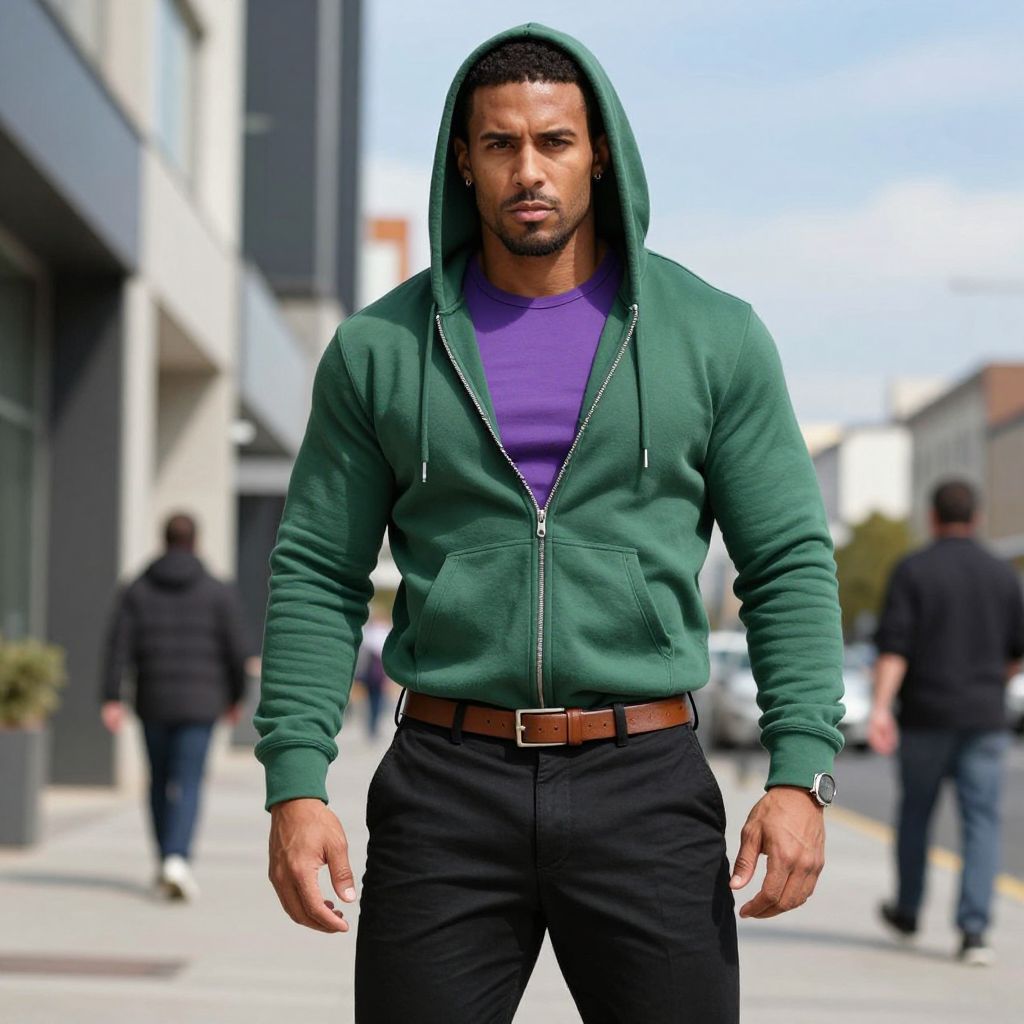 A man wearing a green hoodie with a purple shirt and a pair of black pants with a brown belt, standing in a modern urban setting with a sunny sky and a few pedestrians in the background. The man has a fit and athletic build, with a confident posture and intense gaze, exuding a sense of style and individuality. The overall scene is vibrant and lively, capturing a moment of casual yet sophisticated street fashion.