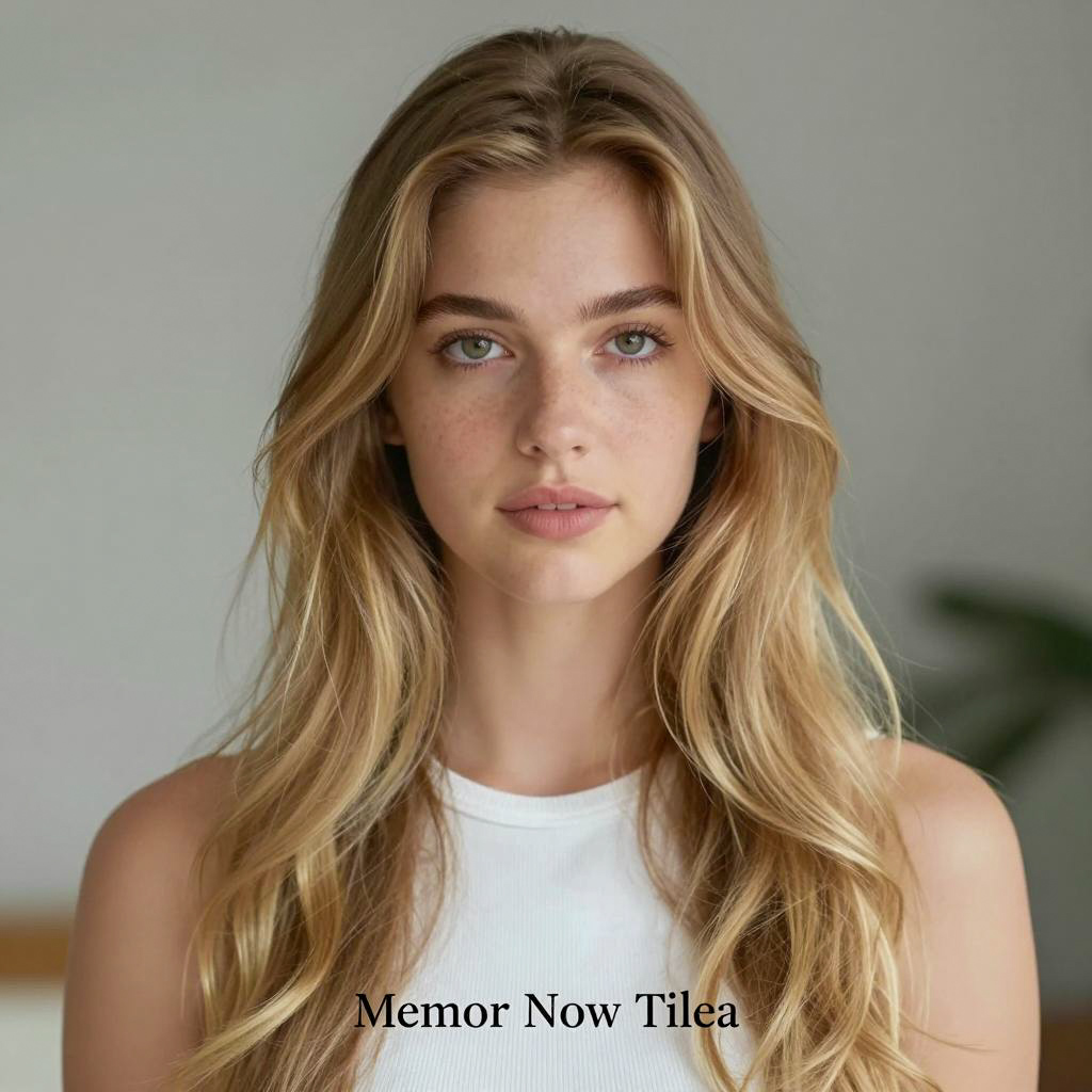 Photograph of a young woman with long, wavy, blonde hair with darker roots, light brown eyes, and freckles on her cheeks. She has a neutral expression, looking slightly to the right. She wears a white, sleeveless top. The background is blurred and gray. Text at the bottom.