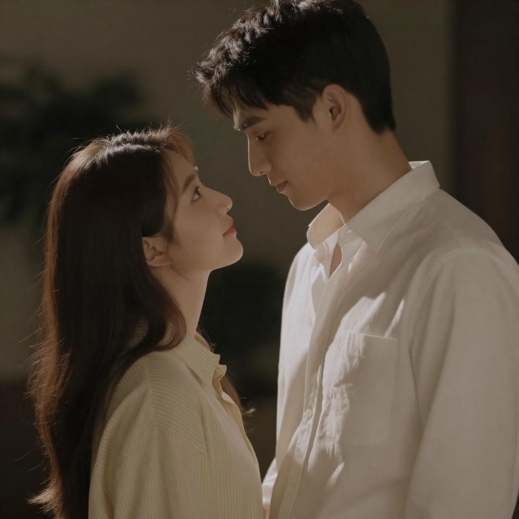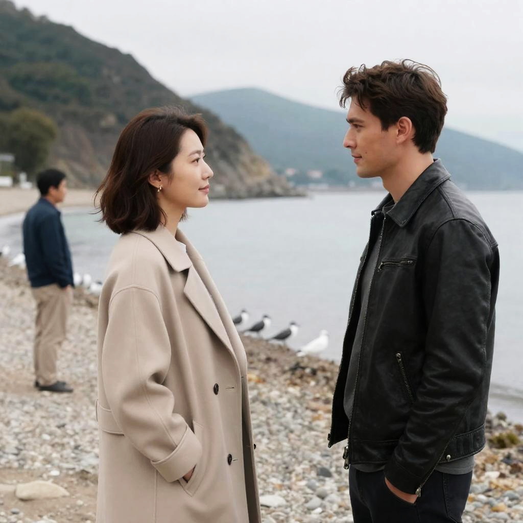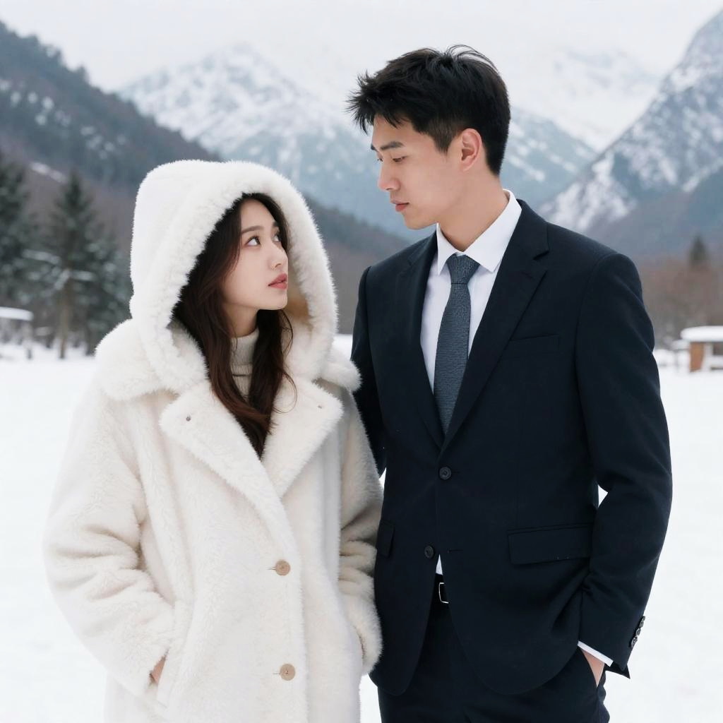 Photograph of an Asian couple standing outdoors near a vintage silver car with a red hood cover. The woman is wearing a white fur coat, white top, and black pants. The man wears a beige trench coat. They are facing each other with a blurred park background and soft sunlight filtering through trees.