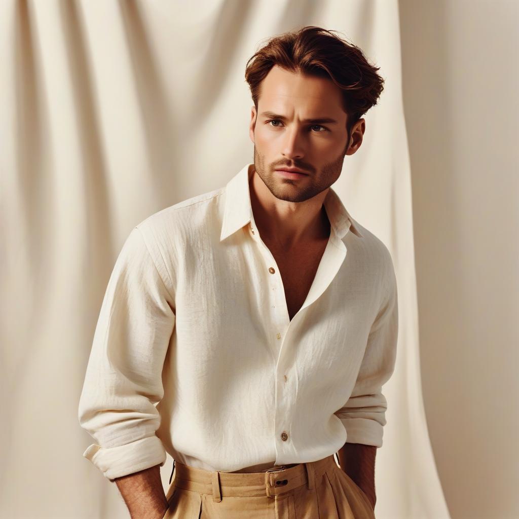 33-year-old man, linen shirt with chinos, styled by Lotta Volkova, off-white textured backdrop, editorial fashion shoot, high saturation, warm lighting