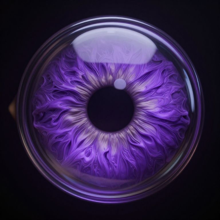A highly detailed, super realistic purple retina part of a glass, with intricate textures and reflections, set against a dark background.