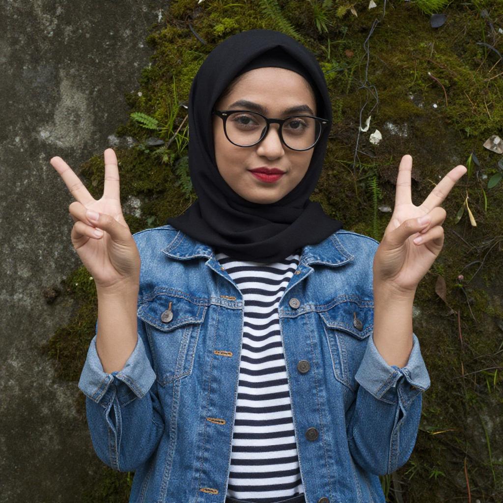 Photograph of a young woman with light skin, wearing a black hijab, black-rimmed glasses, and a denim jacket over a white and black striped shirt. She is making a double peace sign with both hands, standing against a moss-covered wall. Her red lipstick contrasts with her neutral outfit.