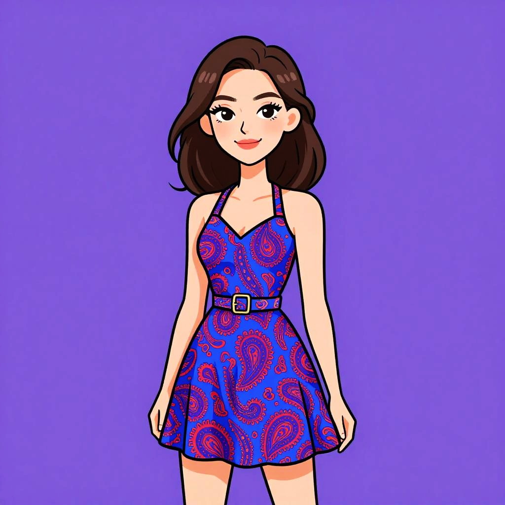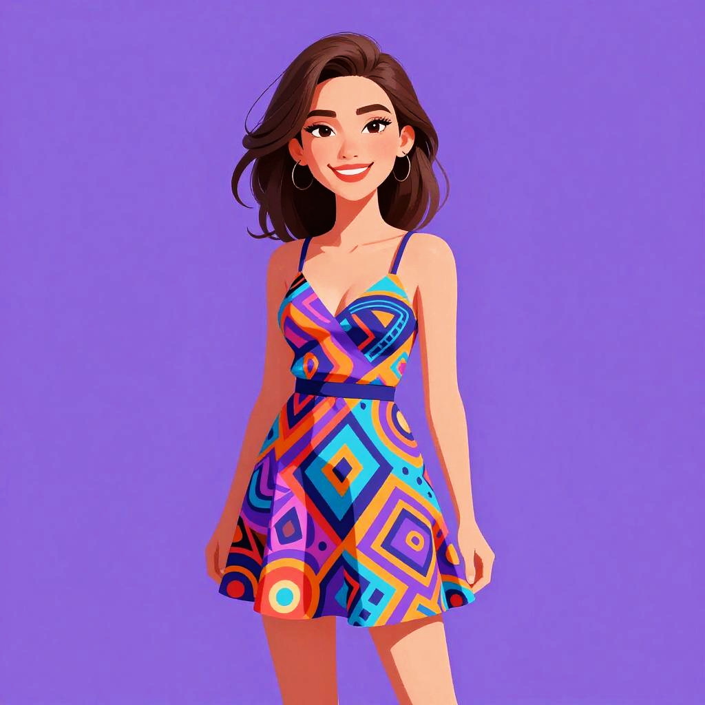 Digital illustration of a young woman with fair skin and shoulder-length brown hair, wearing a yellow sundress with blue paisley patterns and thin spaghetti straps. She has large hoop earrings and a confident smile, standing against a solid purple background. The dress flares out slightly above her knees, and she stands with one hand on her hip. The artwork is in a bold, colorful, cartoon-like style with clean lines and vibrant colors.