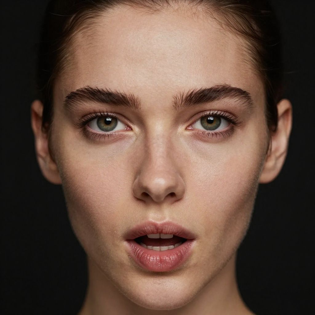 A highly detailed, close-up, digital photograph of a young woman's face with fair skin and light green eyes. She has dark brown hair pulled back, prominent eyebrows, and slightly parted pink lips. Her skin has a smooth texture with visible pores and a natural, slightly dewy finish. The background is solid black, making her face the focal point. The lighting is even, highlighting her facial features and giving her eyes a reflective quality. The overall style is realistic and lifelike.