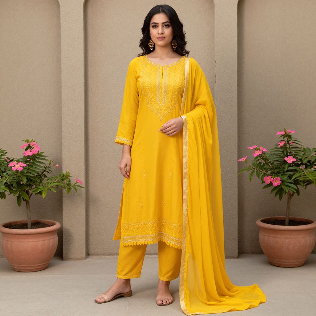 Woman wearing a vibrant yellow embroidered long kurta paired with matching churidars and a flowing dupatta, standing gracefully outdoors with two potted plants—one adorned with pink flowers—flanking her sides against a textured wall backdrop.