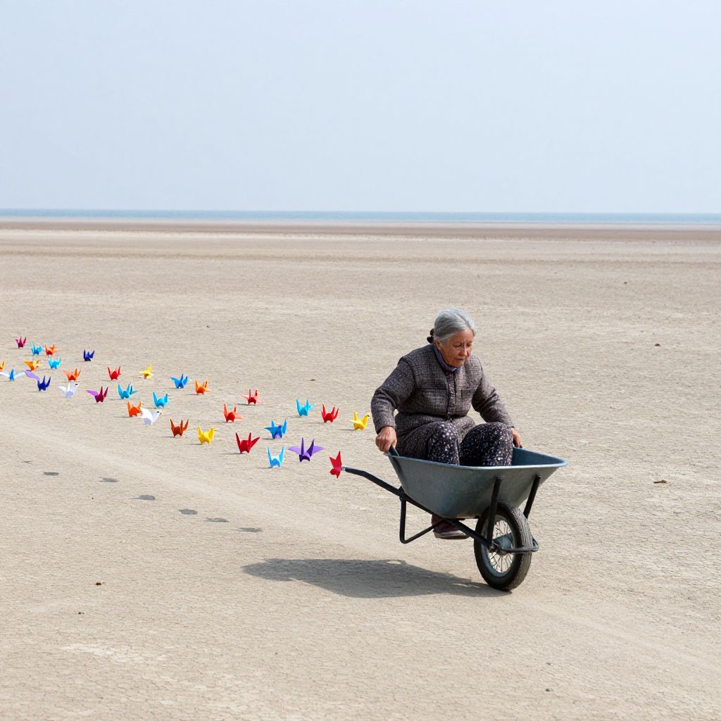 An elderly woman rides a wheelbarrow-powered chariot across the surface of a dried-up ocean, trailed by flocks of chromatic paper cranes.