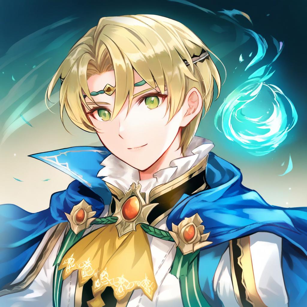 Alfred (fire emblem), fire emblem, 1boy, green eyes, blonde hair, short hair, blue cape, long sleeves, yellow ascot, circlet, by artist kutsuki kai, animagine