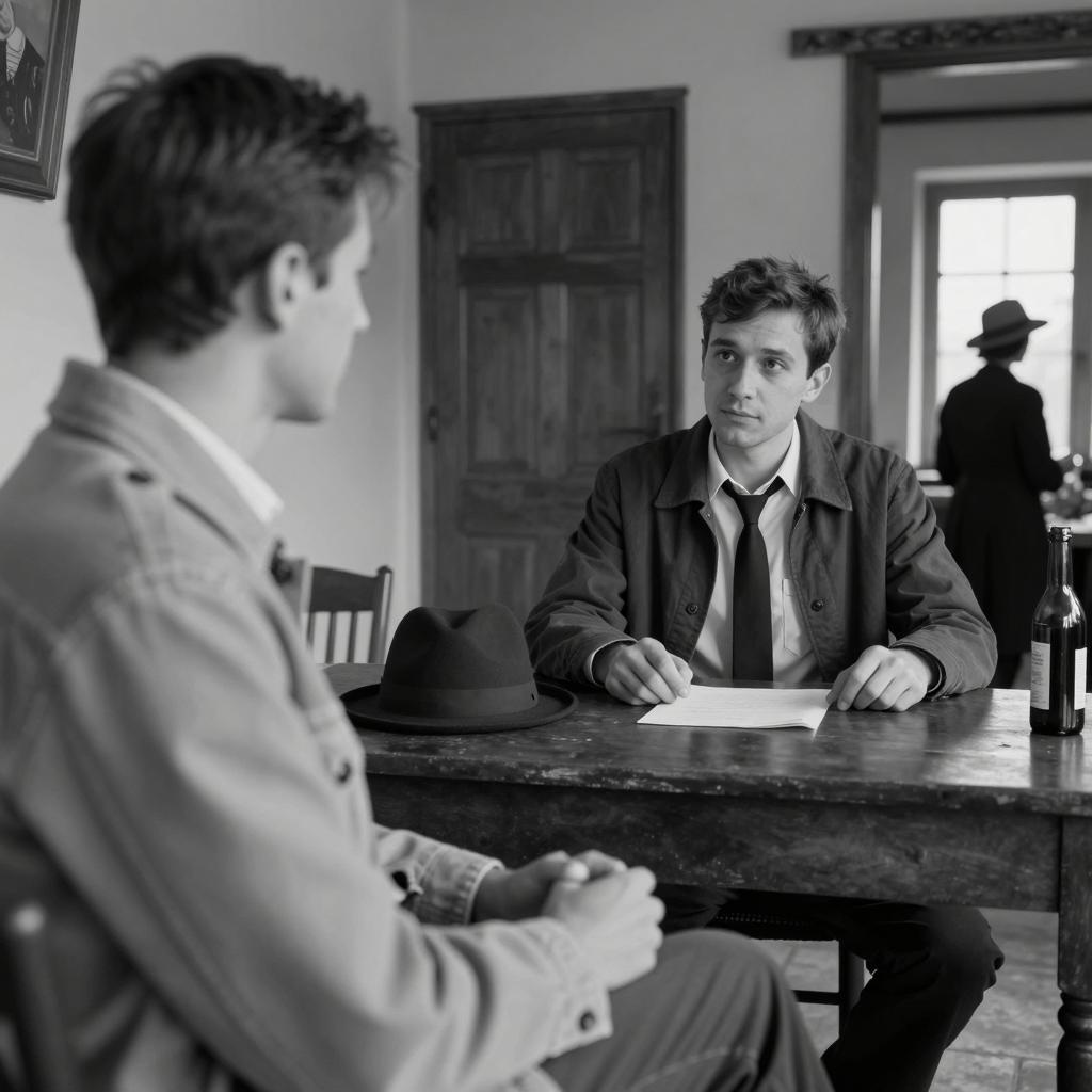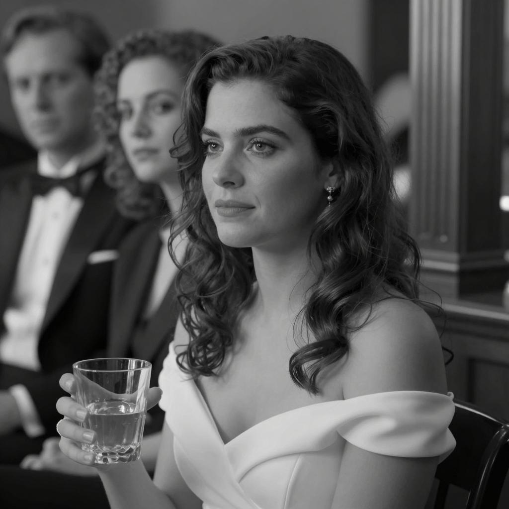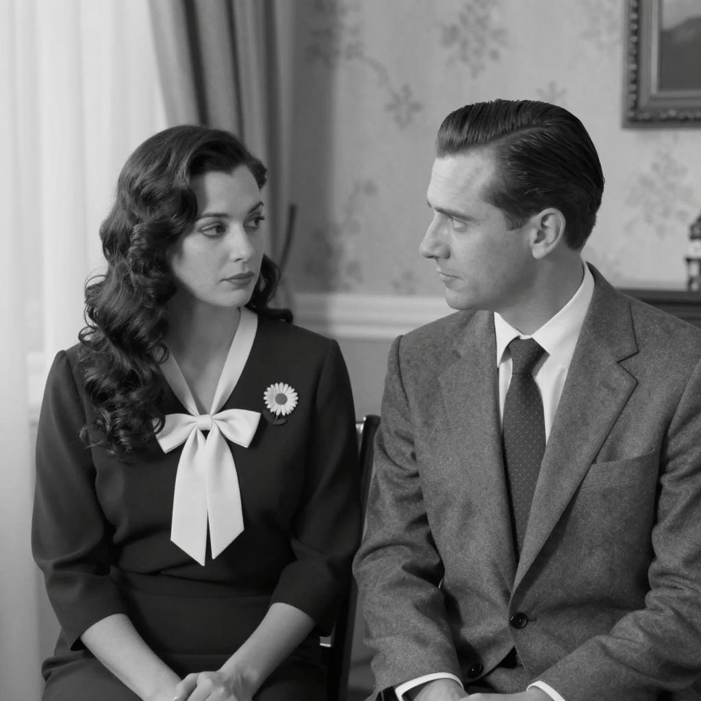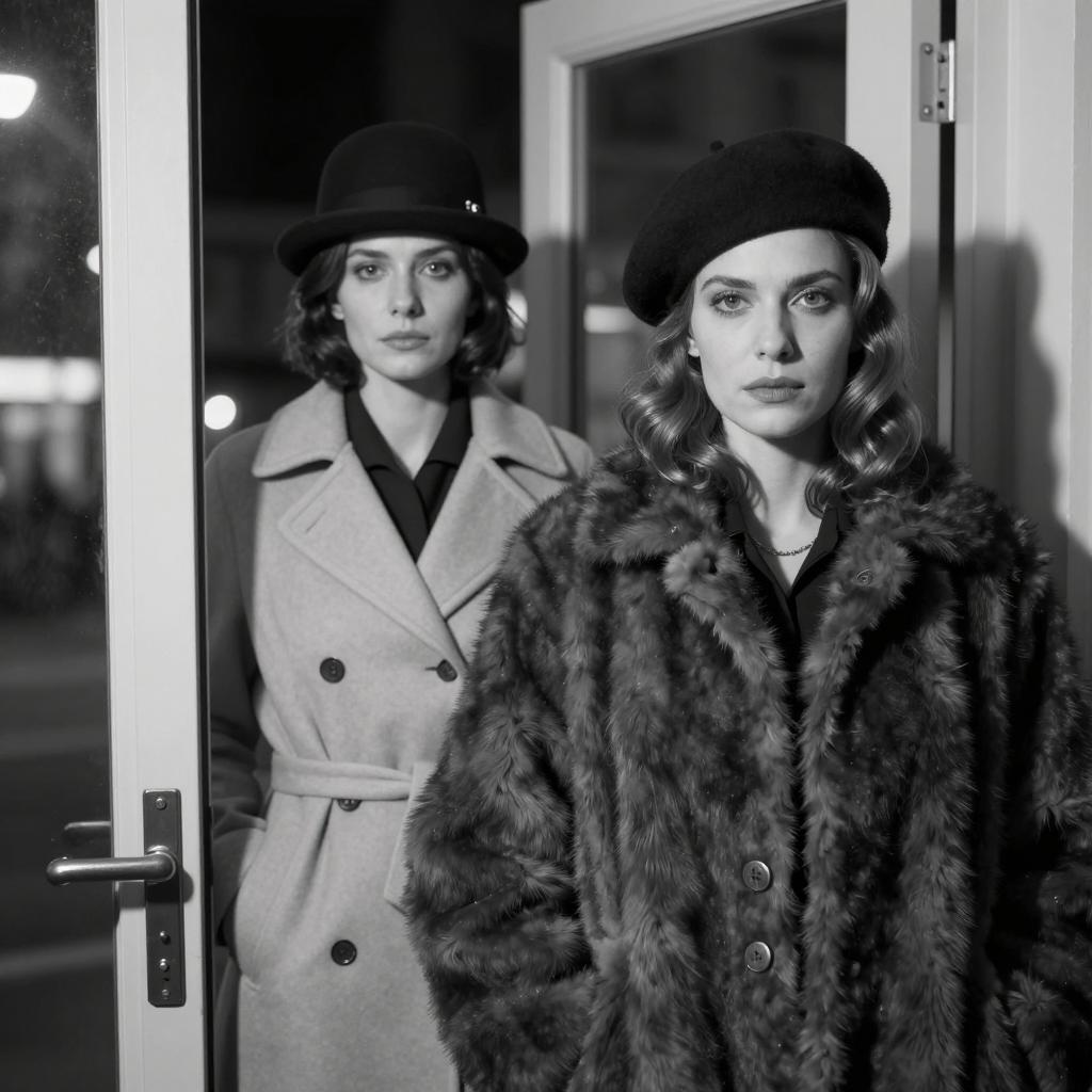 Black and white photograph capturing a vintage-style indoor setting with four adults and a dog. On the left, a woman in a light-colored uniform and headband sits behind a counter with papers, likely in an office or reception area. A tall woman in a dark dress and scarf stands next to her, gently holding a medium-sized dog with black and white fur. On the right, a blonde woman wearing a fur coat and jeans sits facing a man dressed in a dark suit. The background features patterned wallpaper, wall sconces with light, and framed photographs, creating a classic and nostalgic atmosphere.