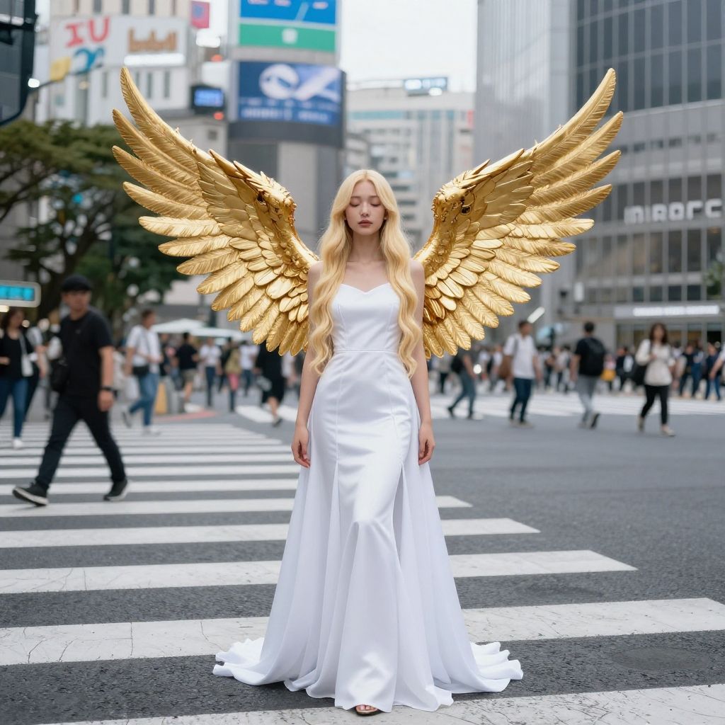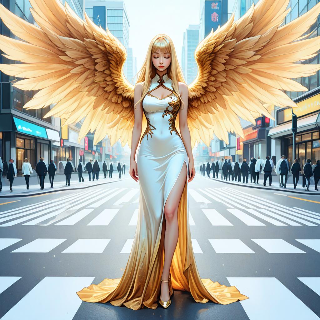 Digital artwork of a blonde angelic woman with large, golden wings standing confidently in the middle of a bustling city street. She wears a form-fitting, white, sleeveless dress with a high slit, revealing her legs. Her eyes are closed, and she has a serene expression. The background features tall buildings with brightly lit signs, and numerous pedestrians crossing the street. The street is marked with white crossing lines, and the scene is vibrant with contrasting colors of black, white, and golden hues. The style is highly detailed, with a blend of realism and fantasy elements.