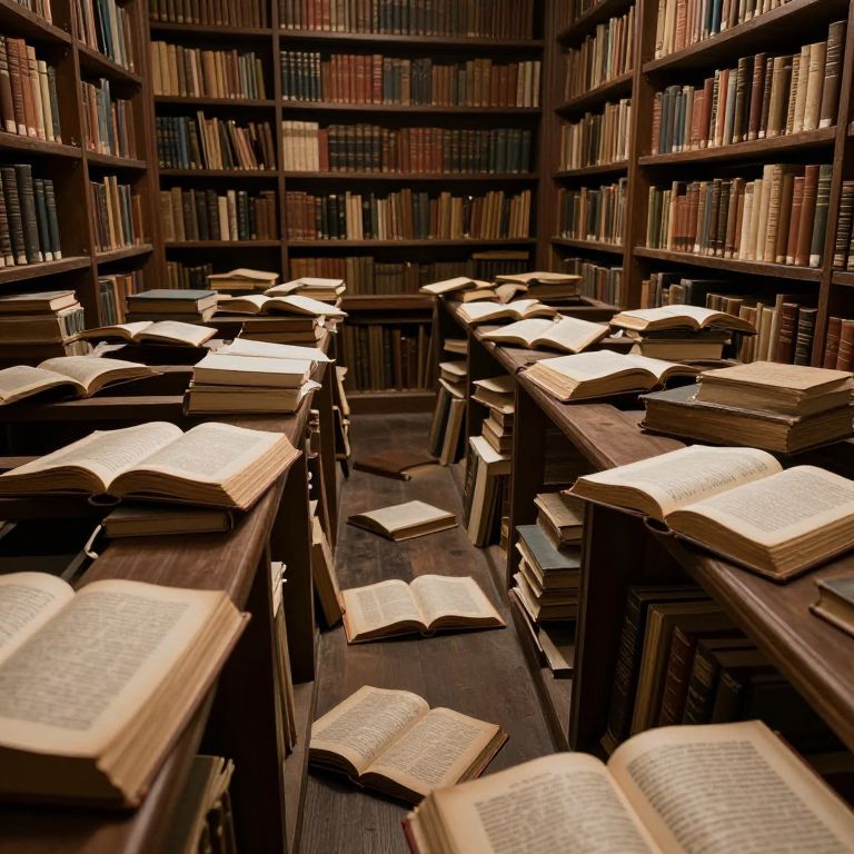 In a labyrinthine library where ancient wisdom whispers and forgotten tales linger, scattered open books and crumbling pages evoke a haunting sense of transience, inviting contemplation on the eternal dance between memory and oblivion.