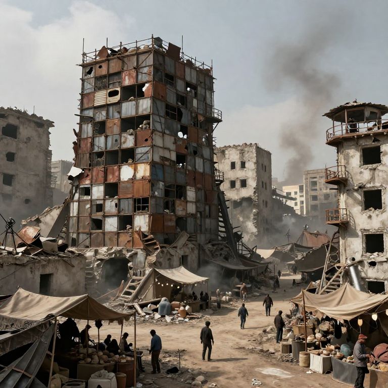 A fortified post apocalyptic settlement nestled in a ruined city, towering barricades made from scrap metal and concrete, watchtowers with guards, makeshift marketplace with people trading goods, smoky skies, a sense of resilience and survival in harsh conditions.
