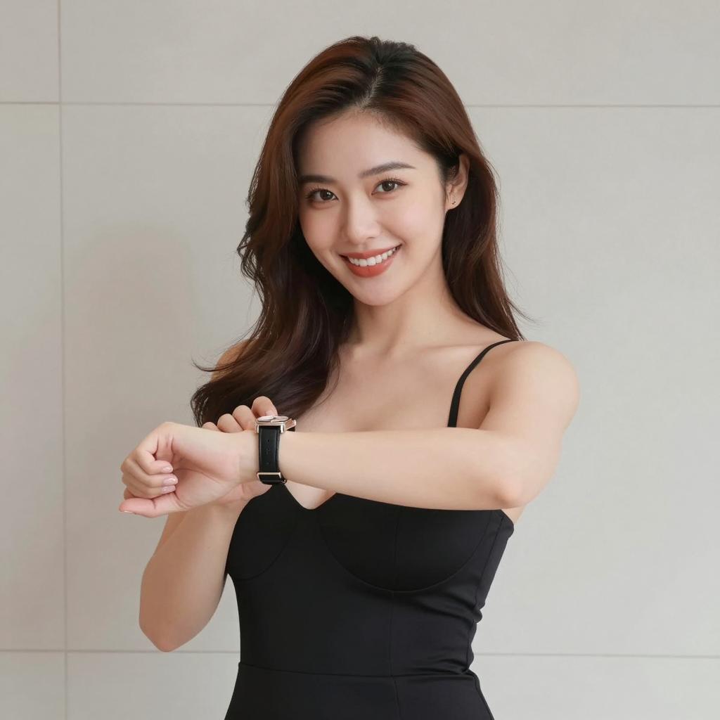Portrait of a young Asian woman with long brown hair wearing a black sleeveless dress, smiling while looking at the camera and checking her wristwatch. The setting has a neutral tiled wall background.