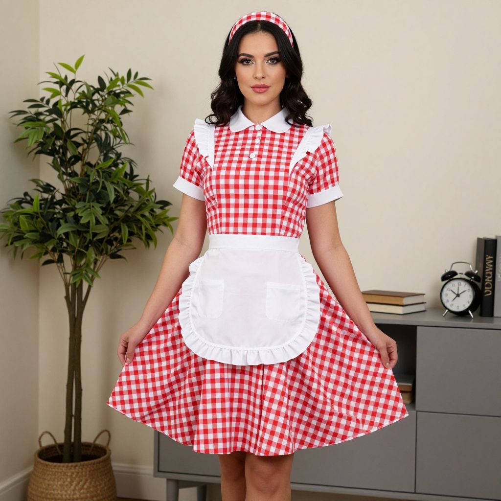 Photograph of a curvy woman with dark hair in a red and white checkered vintage maid dress, white apron, and headband, standing