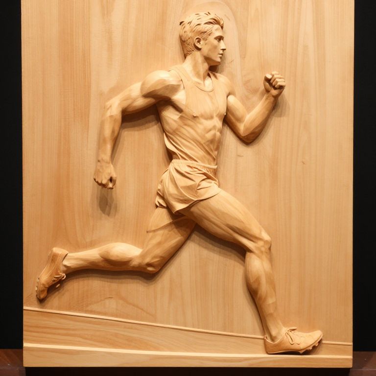 Wood Carving picture of a fit male track star, he has long legs and firm calves:: style of alex ross,