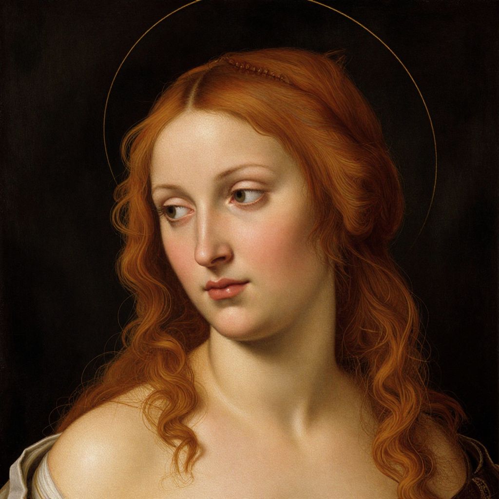 A classical Renaissance-style portrait featuring a woman with vibrant red hair adorned with a golden halo, rendered in high-definition detail reminiscent of Sandro Botticelli's technique, evoking the timeless elegance of his \"Portrait of Simonetta Vespucci as Nymph\" from 1484.