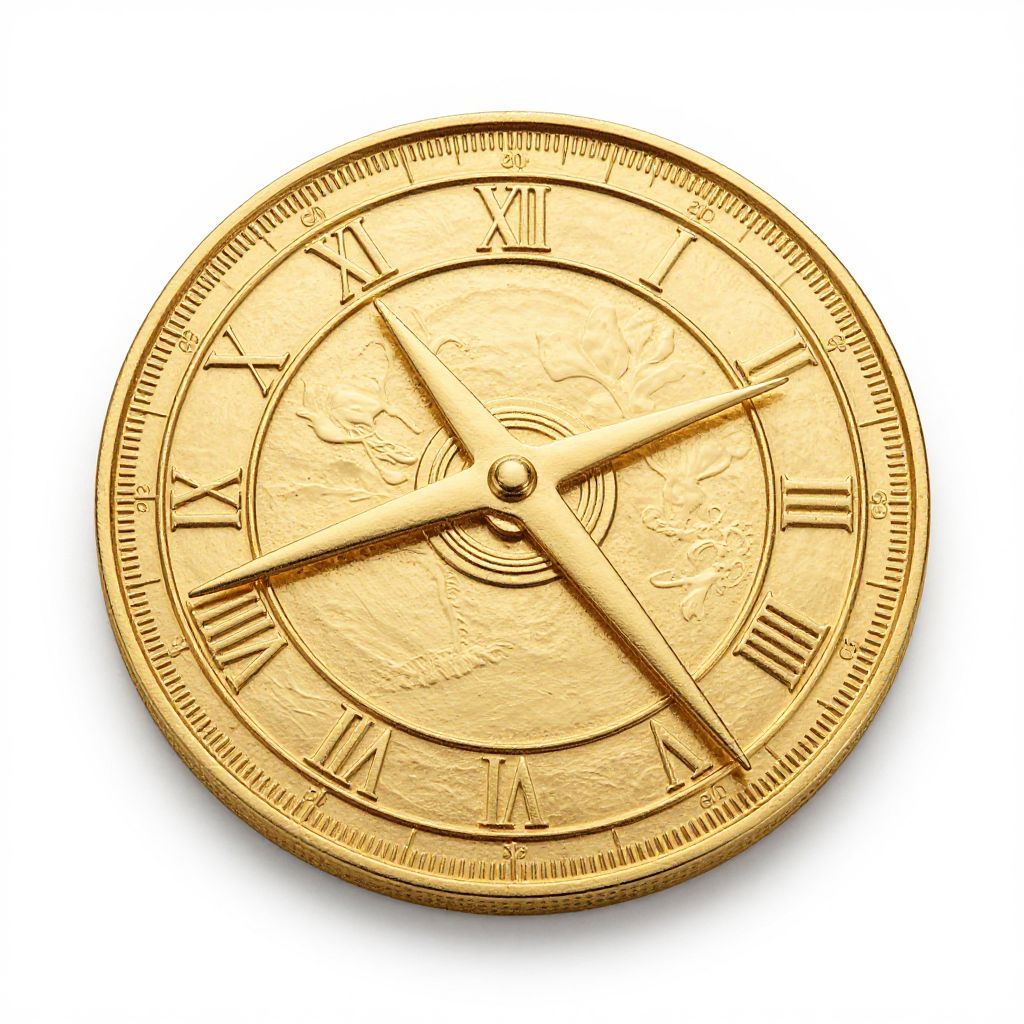 Golden Franklin Mint Universal Sundial, intricately crafted with 24-carat gold plating, showcases a detailed circular design featuring Roman numerals, degree markings, and adjustable gnomon arms, all in pristine condition against a clean backdrop.