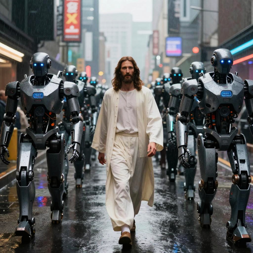 Cinematic ultra realistic image of a man resembling Jesus, dressed in traditional white robes, walking confidently down a rainy dystopian city street. He is flanked and followed by a large group of futuristic silver cyber tech robots with glowing blue eyes. Neon advertisements light up the urban background, creating a moody and futuristic atmosphere.