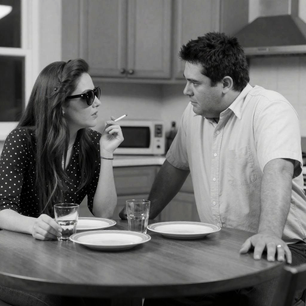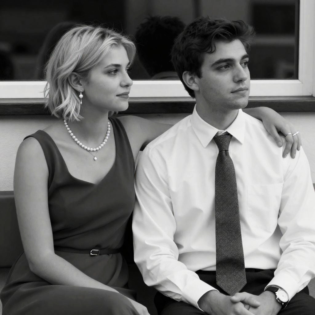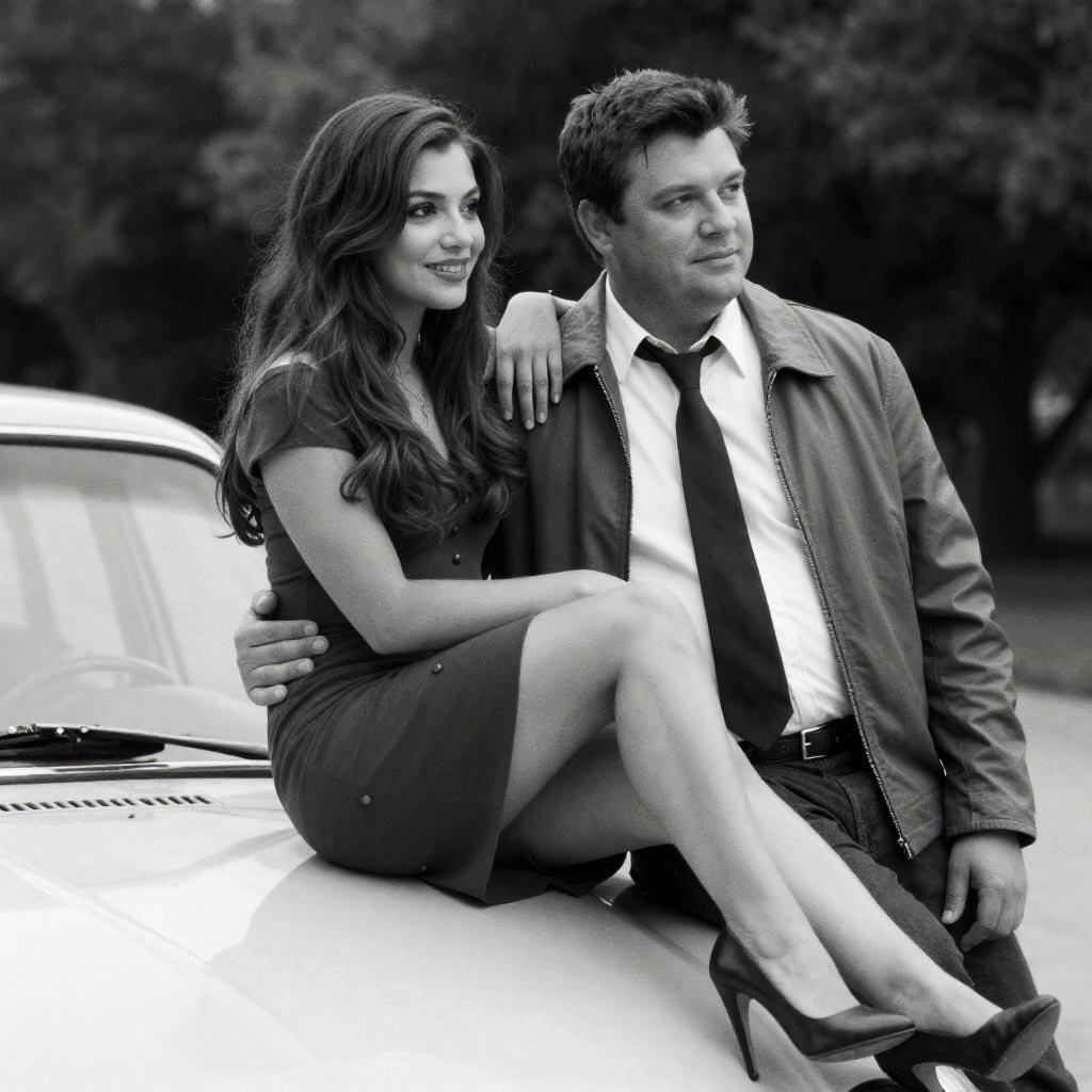 Black and white photograph of a man and woman sitting on the hood of a car. Man with short dark hair, medium build, wearing a jacket and tie, looking to the right. Woman with long hair, wearing a dress and high heels, sitting close to him, smiling. Car hood in foreground, trees in background. Woman's legs crossed, man's arm around her. Both relaxed, casual.