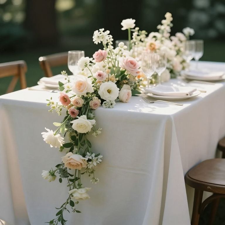 Photograph of an elegantly set outdoor dining table covered with a crisp white tablecloth. The centerpiece features a cascading arrangement of white and pale pink roses, daisies, and small white flowers, with green foliage, draping over the table's edge. Clear wine glasses and white ceramic plates are neatly arranged on the table. The background is softly blurred, suggesting a garden or park setting with natural light filtering through. Wooden chairs with dark brown finishes are partially visible, adding a rustic touch. The overall scene exudes a romantic and serene ambiance.