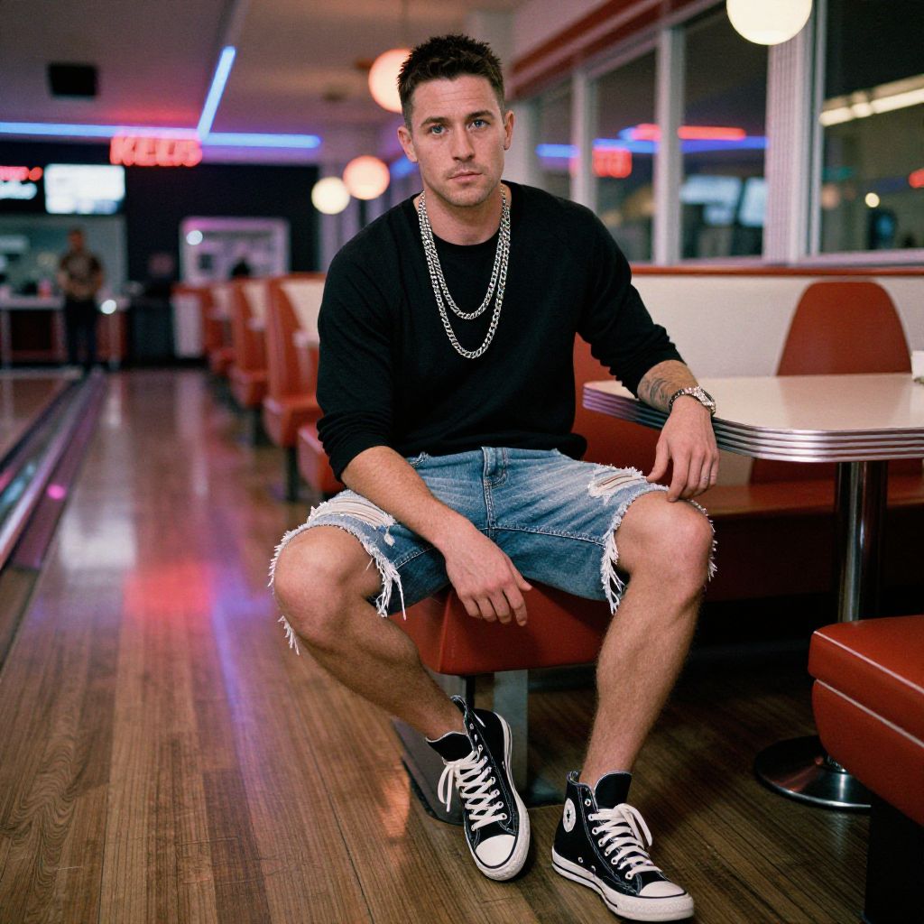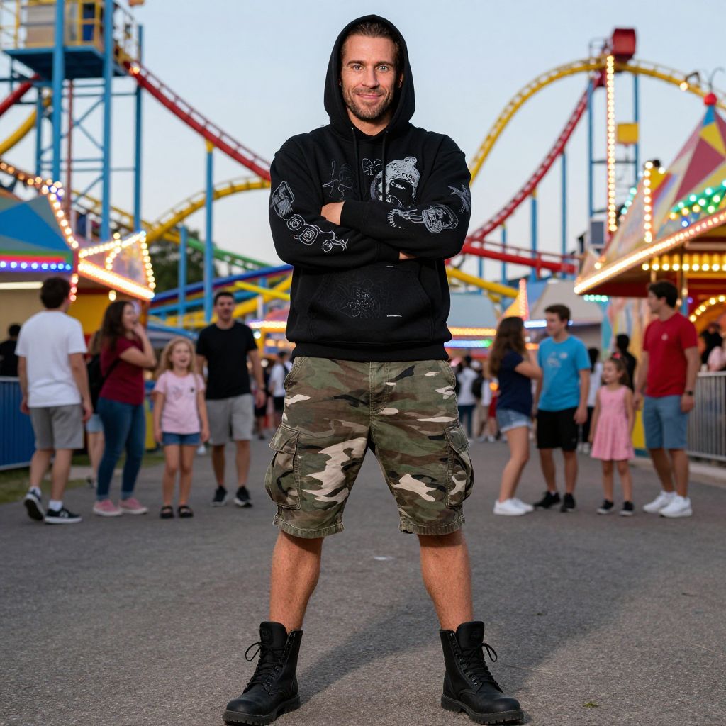 A man, fitted black hoodie with street art motifs, relaxed-fit camo shorts, combat boots, standing in front of colorful roller coasters, vibrant carnival lights, excited families laughing, Chuck Close style, arms crossed, confident smile.Man has masculine face and piercing eyes