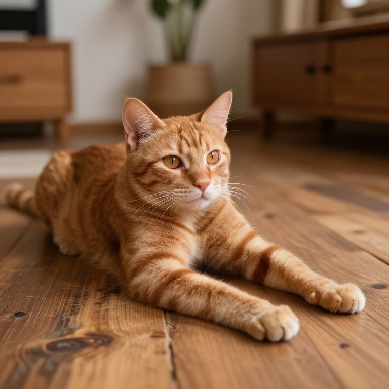 Sexy cat pose, slender ginger tabby stretching luxuriously on rustic wooden floor, captivating amber eyes, detailed fur patterns in soft natural light, cozy bohemian living space setting