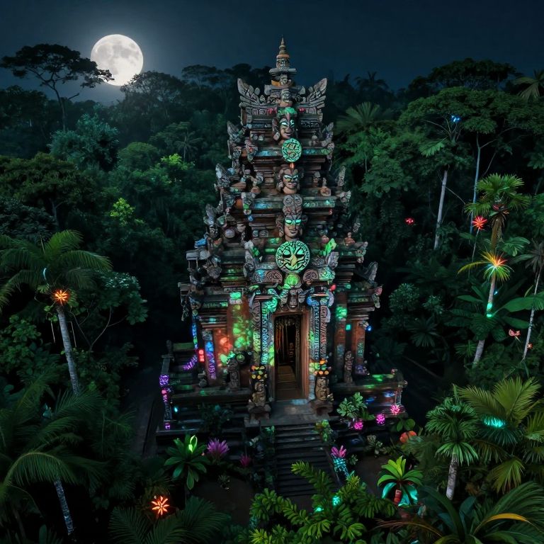 A vibrant, digital CGI image depicts a colorful, intricately detailed Hindu temple nestled in a dense, dark jungle at night. The temple, adorned with glowing neon lights in green, blue, and pink hues, stands prominently in the center. A full moon illuminates the sky, casting a bright, white light over the scene. The temple's ornate spires and carvings are illuminated, highlighting its ancient, mythical architecture. Surrounding the temple are tall trees, lush foliage, and various tropical plants, creating a rich, textured backdrop. The image exudes a mystical, otherworldly atmosphere with its vivid colors and dramatic lighting.