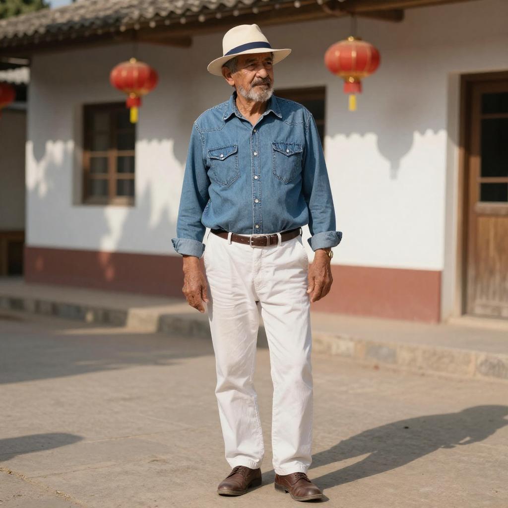 Photograph of an older man standing in a sunlit outdoor area. He's wearing a blue denim shirt, white pants, brown belt, brown shoes, and a white hat with a blue band. He has a brown beard and is looking slightly to the side. The background shows a white building with red decorations and shadows from overhead structures. The scene has a warm, sunny feel.