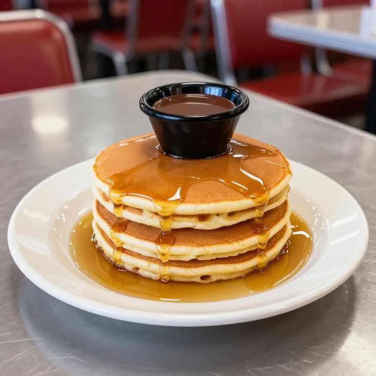 Stacked golden pancakes glisten with syrup, crowned by a small black bowl of chocolate sauce, presented on a pristine white plate atop a metallic dining table at the Midway Diner.
